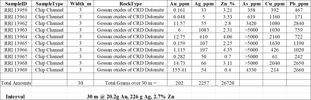 Table 1: Full 30m channel sampling results with the interval. For reference, using a 24 m continuous subset of the channel interval, the average weighted grade is 25 g/t gold and 290 g/t silver. The sampling is oblique to strike.