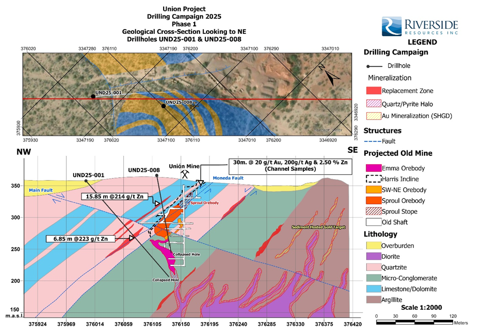 “Riverside is excited by the high grade of 600 gram-metres gold and 6,780 gram-metres silver represented by the 30 metres of continuous chip channel sampling from the Union Mine area,” said John-Mark Staude, President and CEO of Riverside Resources. “These results, together with the completed Phase 1 drill assays from Union Mine, Union Norte and El Cobre, reinforce that drilling is intersecting the types of CRD-style alteration and multi-element signatures we were targeting, including anomalous zinc, silver, gold and lead consistent with the historic mining district and also finding sediment-hosted gold (“SHGD”) indicators is a key development in progressing the Union Project and supports the technical rationale for aggressive follow-up work in 2026.”