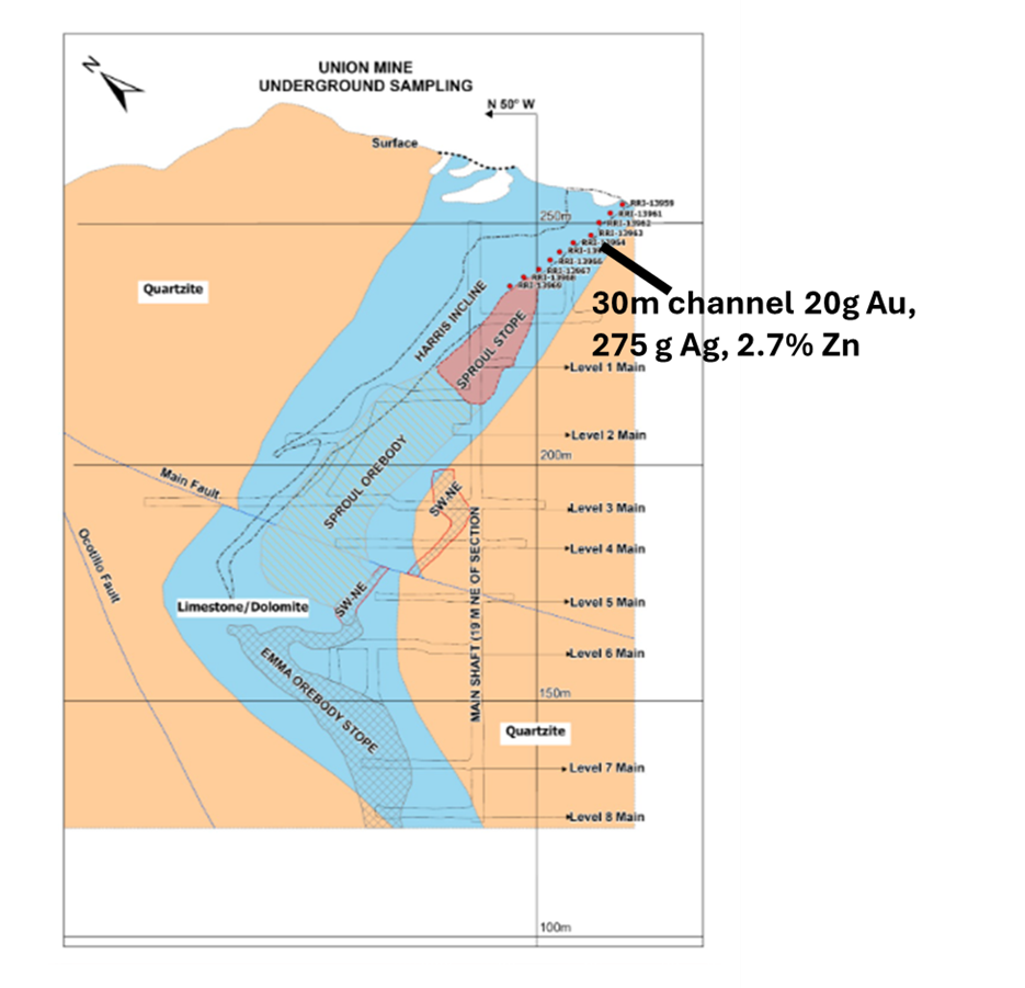 Figure 1: Cross section through the Union Mine area showing Phase 1 drill holes (including holes 1 and 8), interpreted mine workings/ore zones, and the location of the continuous channel sample along the Union Mine decline wall. The section illustrates the spatial relationship between the high-grade Au-Ag-Zn channel interval and nearby drill intercepts and provides geological context for potential follow-up targeting for both CRD and SHGD.