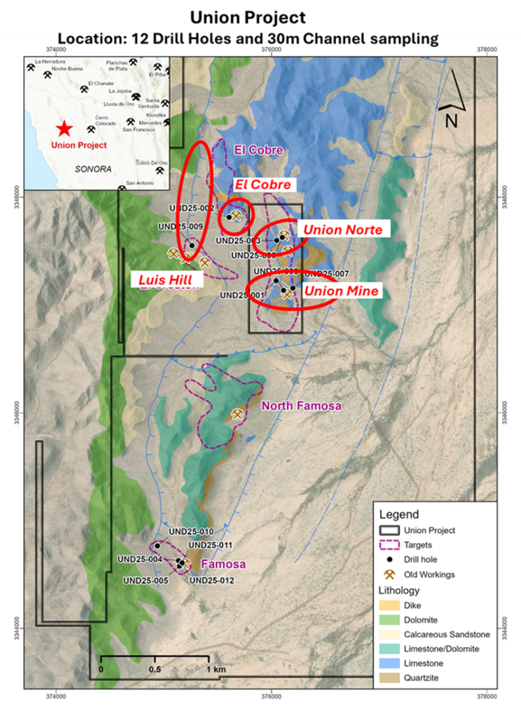 The location of all 12 drill holes from the 2025 Phase I programs are shown in the drill plan (Figure 3), with the channel sampling area and the Union Mine, Union Norte and El Cobre target areas highlighted.