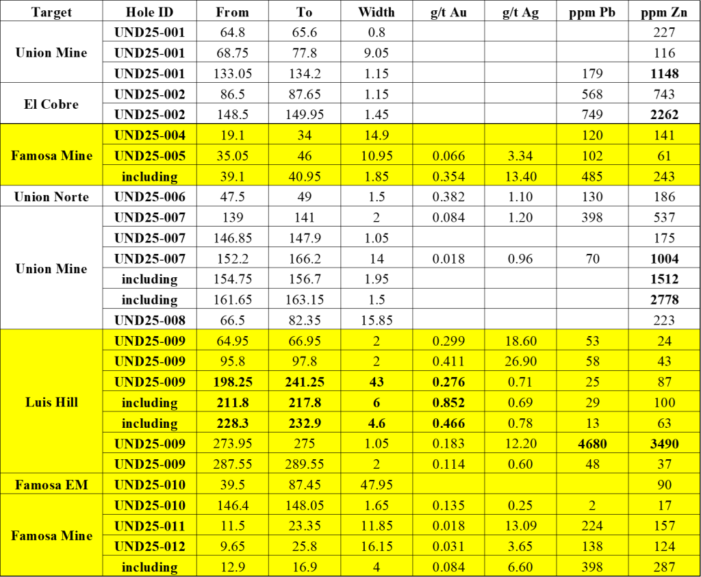 While the results from the Famosa Targets and Luis Hill were disclosed in the 2026-Jan-12 News Release, Table 2 discloses the full results from the 2025 program, with the previously drilled holes highlighted in yellow.  Hole 3 is not shown as it is aborted early due to poor drilling conditions, it was redrilled as hole 6 to test and hit mineralization in the target area initially planned for hole 3. Further drilling at Union Norte can be pursued and is recommended for both CRD and SDHG targets.