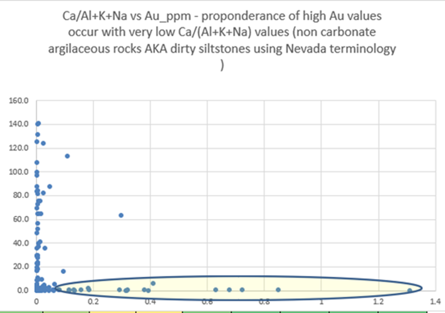 Figure 4: Gold with high Al + K + Na, meaning not with the dolomite and limestone for the sediment-hosted gold aspects like Nevada. Carlin geochemistry for the Luis Hill Hole 9.