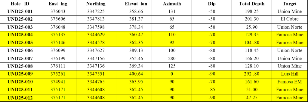 Table 3: Complete drill collar information. The drill results from the unshaded holes are being released today and include results from the Union Mine, Union Norte and El Cobre. The yellow-colored holes were announced 2026-Jan-12.