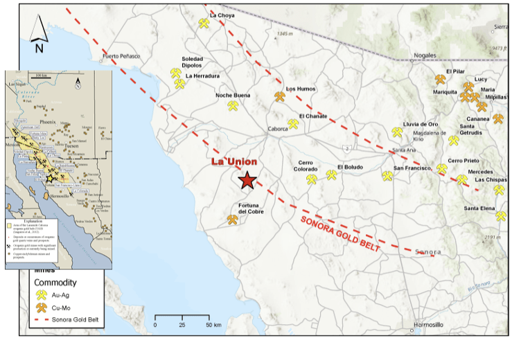 - La Union is a 2,604 ha, road accessible, high-grade gold carbonate replacement project lying at the edge of the Sonoran Gold Belt (SGB) of northern Mexico. Richest gold belt with several multi-million oz gold deposits lie in this area of the SGB including: San Francisco (1.4M oz M+I)1 , and La Herradura (5.5M oz P+P; 6.7M oz M+I)2.