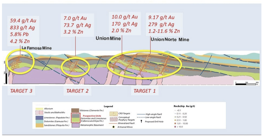 - La Famosa target with 59.4 g/t Au, 833 g/t Ag, 5.8% Pb and 4.2% Zn grades.