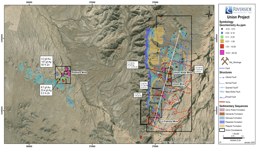- Surface grab and chip channel sampling by Riverside in 2021 with 13 of 103 samples returning significant grades: gold from 0 to 83.2 g/t, silver from 1.1 to 4816 g/t, lead from background to 10.3%, zinc from background to 30%.