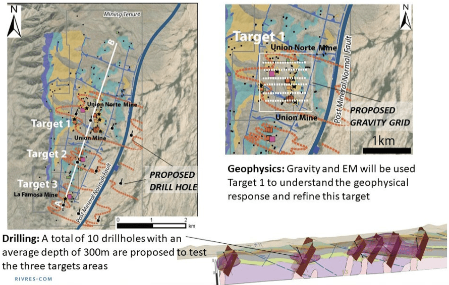 - Drill a total of 10 holes at an average depth of 300m to test the three target areas
